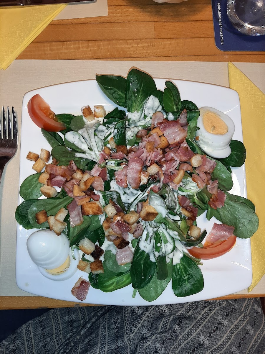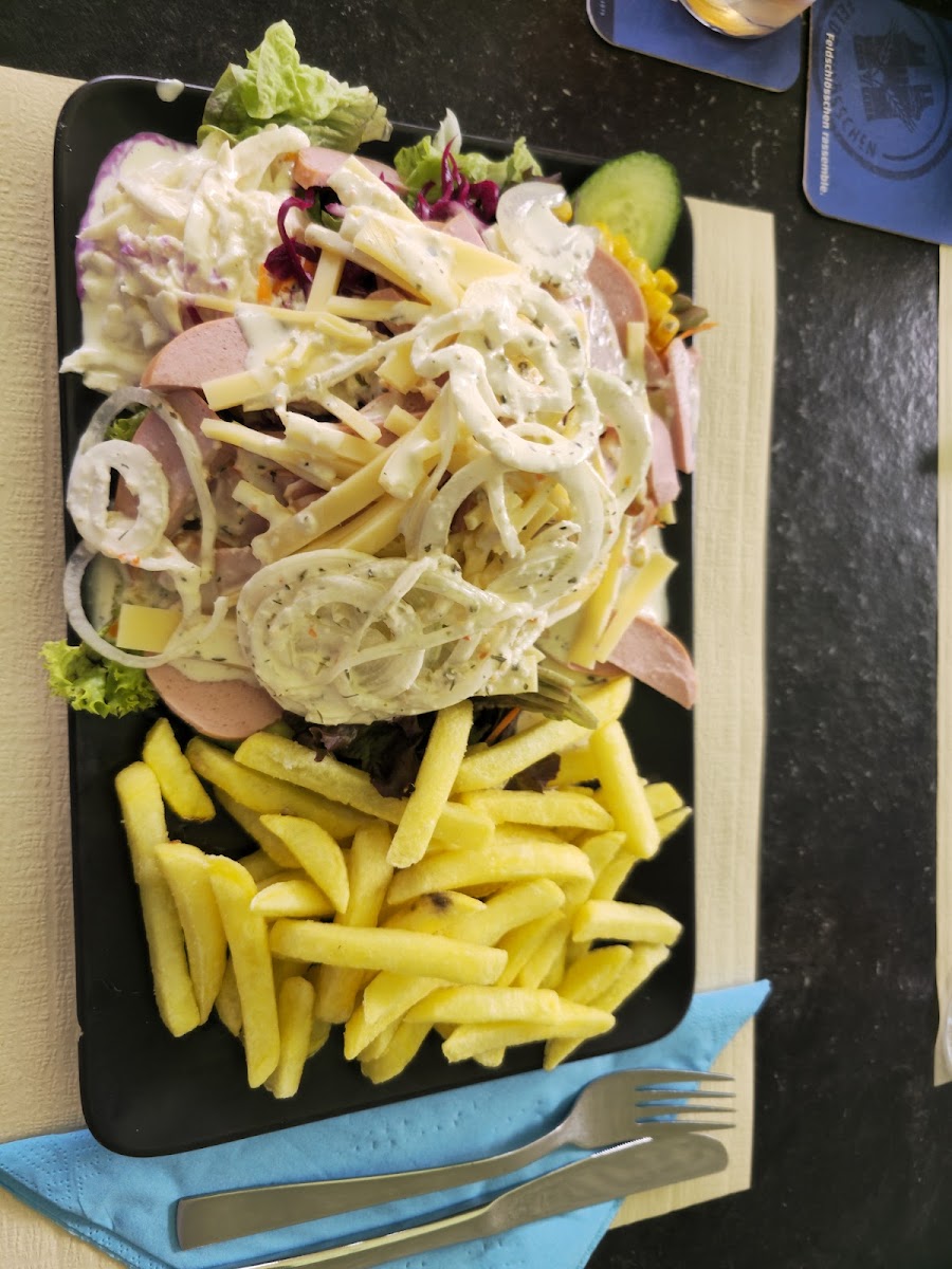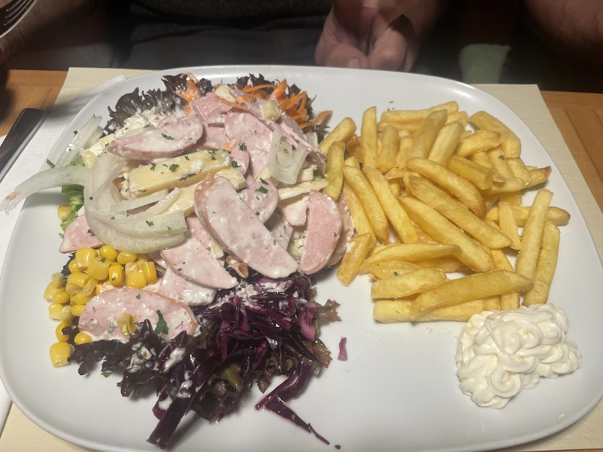 Der Wurstsalat war sehr lecker und auch schön angerichtet und die Pommes haben auch geschmeckt. Das Cordon Bleu meiner Freundin war nicht überwältigend aber gut. Die Gartenwirtschaft ist leider direkt an der Strasse aber der Verkehr zum Glück nicht so stark.